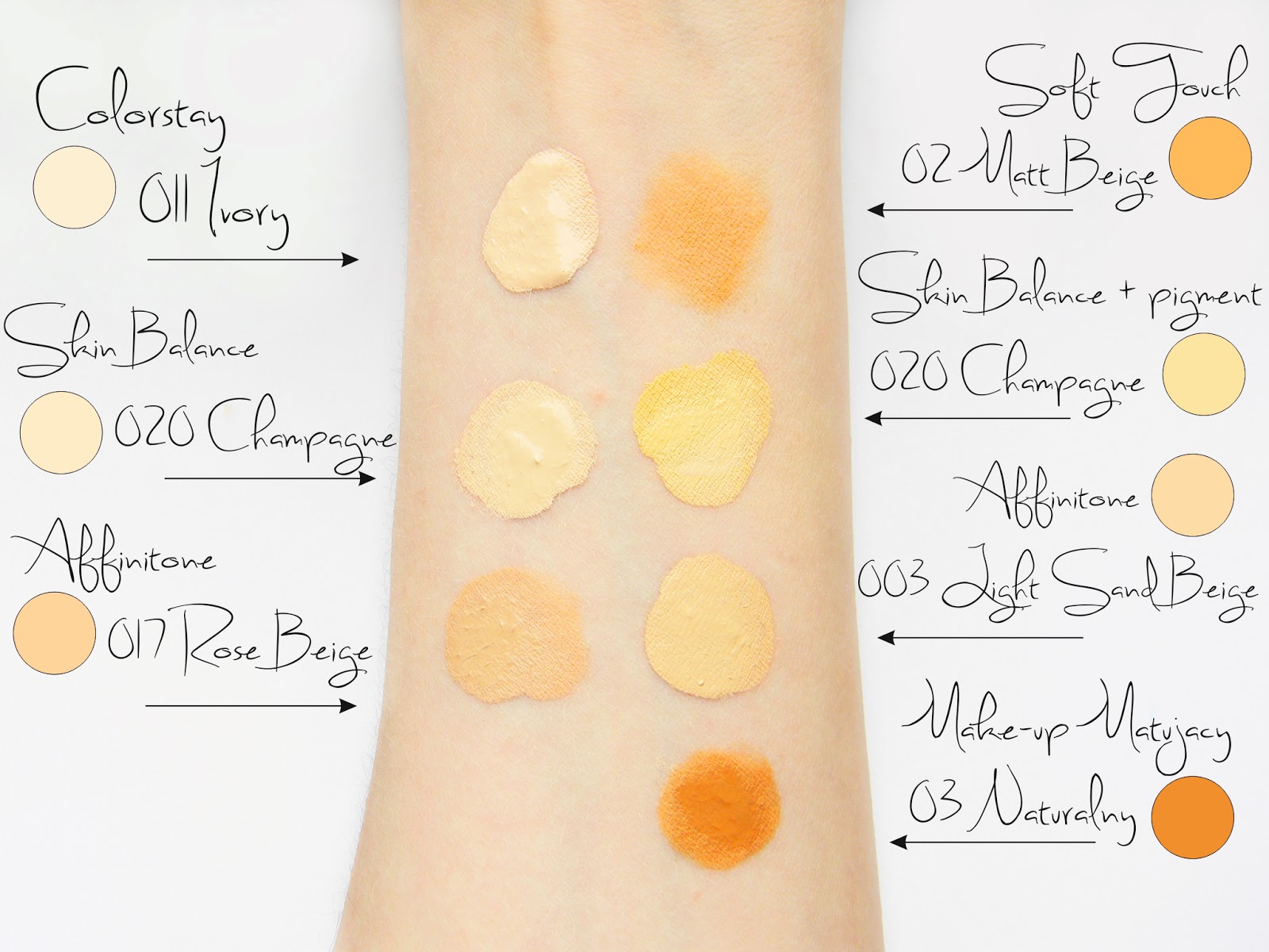 Niestety, na zdjęciu nie udało mi się uchwycić kontrastu, jaki zaszedł pomiędzy moją skórą a chłodnymi podkładami. Wszystkie wyszły żółtsze, niż w rzeczywistości. Po lewej macie te różowe: Revlon Colorstay, Pierre Rene Skin Balance i Maybelline Affinitone. Po prawej natomiast żółte: Essence Soft Touch, Pierre Rene Skin Balance zmieszany z żółtym pigmentem, Maybelline Affinitone oraz Soraya Make-up Matujący (na zdjęciu wyszedł okropnie pomarańczowo). Jeśli chodzi o Affinitone 003 - jest to kolor dość neutralny, choć wydaje mi się, że zbyt różowy dla mojej ciepłej karnacji.
